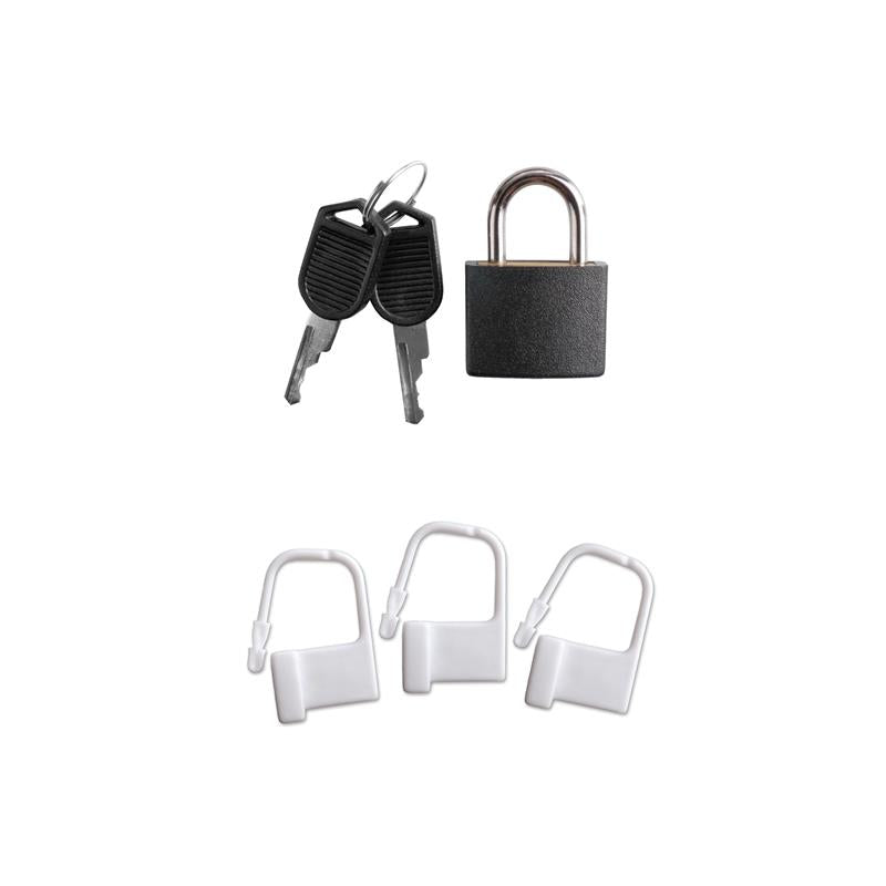 - Incluye: 1 candado, 2 llaves y 3 candados de plástico