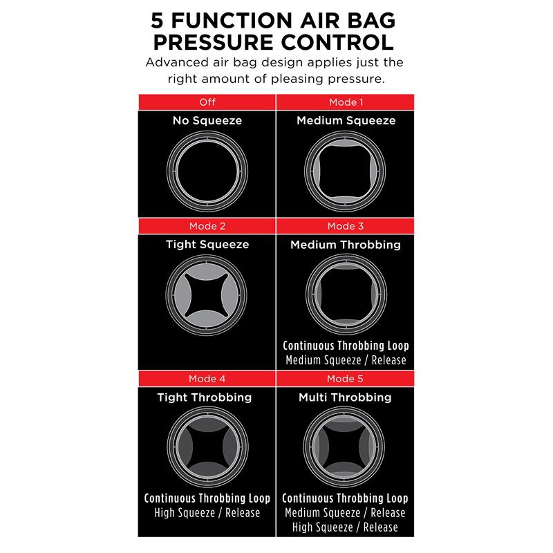 Instrucciones de funcionamiento: Para activar la función de vibración, pulsa una vez el botón superior. Presiona nuevamente para recorrer las velocidades y los patrones. Para desactivar la vibración, mantén pulsado el botón superior durante tres segundos. Para activar la función airbag, pulsa una vez el botón inferior y presiona nuevamente para recorrer los modos, y para apagar las bolsas de aire y liberar presión, mantén presionado el botón inferior durante tres segundos.